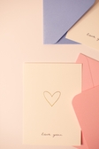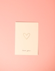 Конверт та Листівка одностороння надрукована на якісному білому картоні, з тисненням золотого сердечка та конверт рожевий.